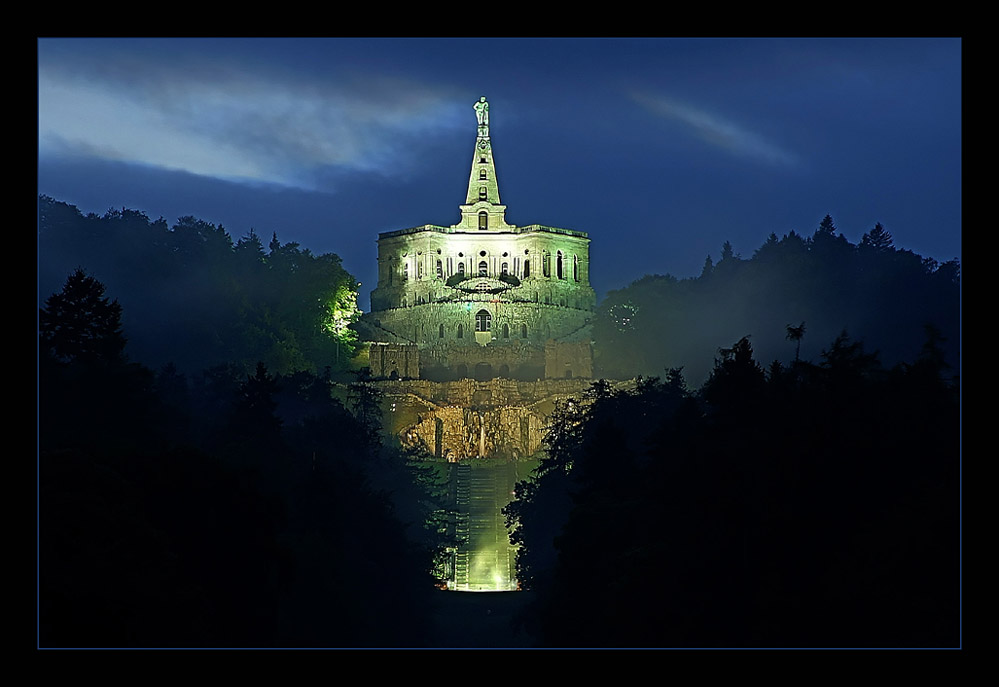 Der Herkules im Park Wilhelmshöhe in Kassel während der beleuchteten Wasserspiele (jeden ersten Samstag im Monat). Nachtaufnahme in DRI-Technik.