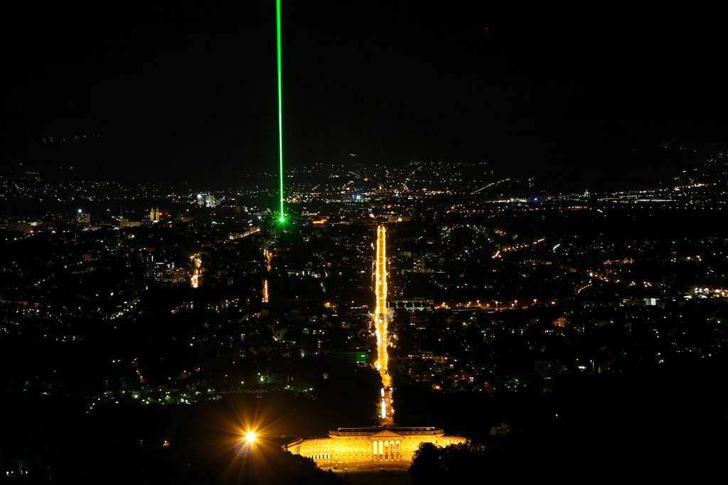 Testinstallation des neuen Laser- Equipments der Kunstinstallation Laserscape Kassel vom Zwehrenturm aus in Richtung Herkules.