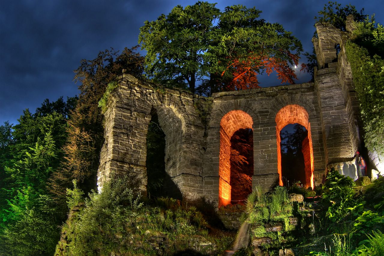 am Viadukt während der beleuchteten Wasserspiele im Park Wilhelmshöhe in Kassel