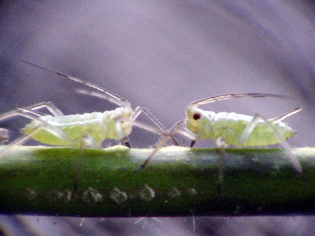 zwei Blattläuse, extreme Makroaufnahme mit Digitalkamera mit zusätzlichem, verkehrt herum vor die Kamera gehaltenem Objektiv meiner Spiegelreflex-Kamera (Retro-Stellung). Sorry, aber die Schärfe ist bei dieser Methode nicht unbedingt die beste, dafür ist man aber na dabei ;-)