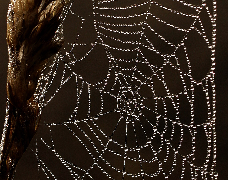 morgendliche Tautropfen im Spinnennetz