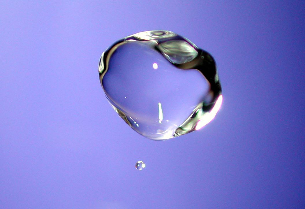 Makroaufnahme eines fallenden Wassertropfens mit Coolpix 990 und Blitzgerät.