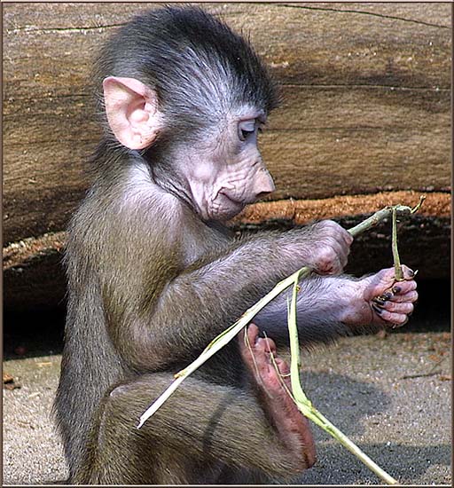 Kleiner Pavianjunge beim Spiel, festgehalten mit Canon D30, Zeit: 1/350 sec, Blende: 6.7, 300mm, Einbeinstativ. Im Zoo Frankfurt.