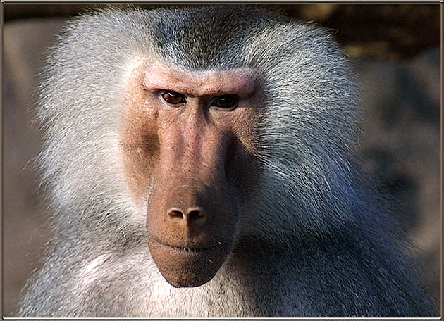 dies ist der ehrwürdige Chef der Paviantruppe im Frankfurter Zoo. Canon D30, 1/750s, Blende 8, Brennweite 300mm, EBV: leichte Tonwertangleichung, unscharf maskiert und Rahmen.