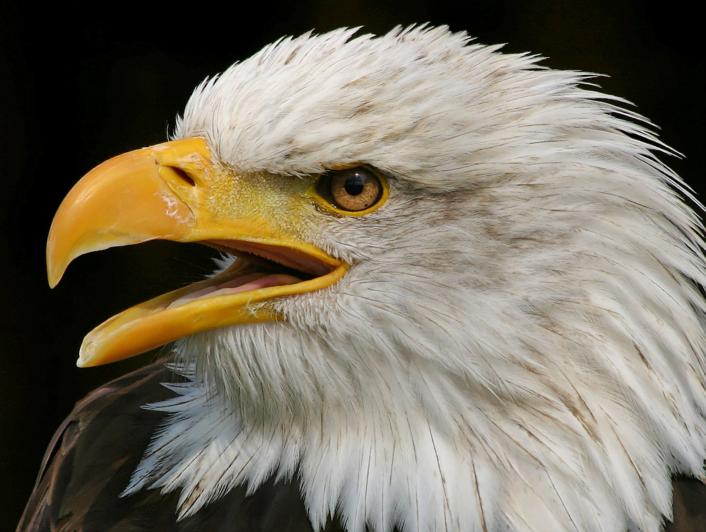 Porträt eines Weißkopfseeadlers der Greifvogelstation im Tierpark Sababurg im Reinhardswald / Nordhessen.