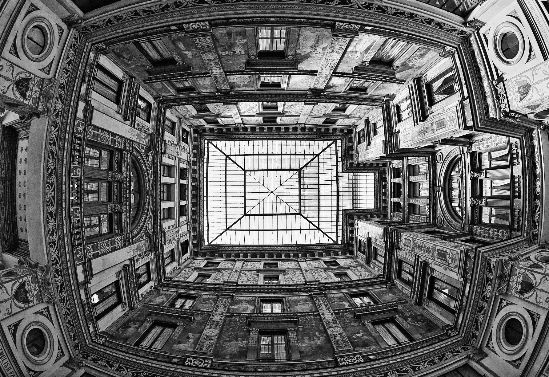 Der Innenhof des Jugenstilgebäudes ist mit einer Konstruktion aus Glas und Metall überdacht.