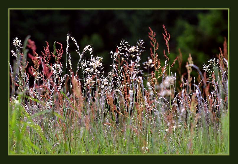 Am frühen Abend auf einer Waldwiese, ein paar schöne bunte Gräser im abendlichen Licht. Canon D30, 1/250s - Blende 5,6 - Brennweite 155mm.