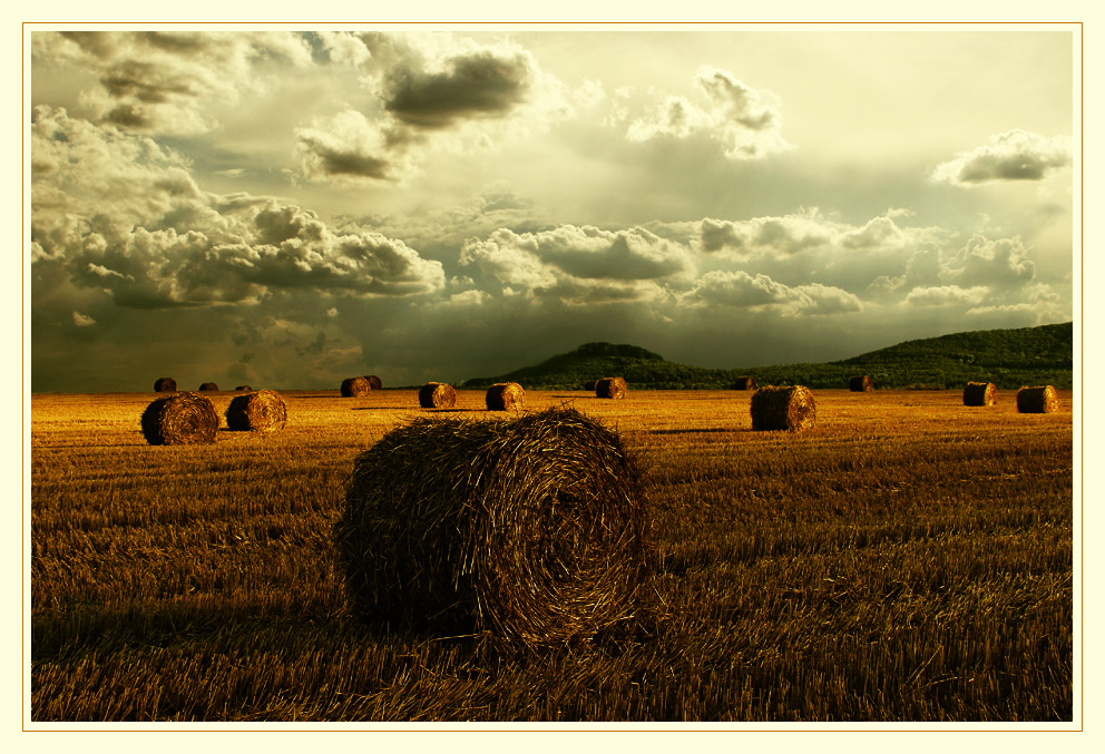 einer der Augenblicke, wo das Lichtspiel der ziehenden Wolken einen schmalen Streifen des Feldes bedachte.