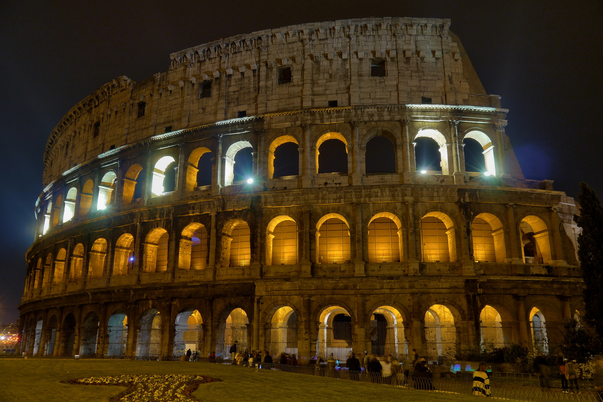 Das erste steinerne Amphitheater Roms war das 29 v. Chr. unter Augustus eingeweihte Amphitheater des Statilius Taurus. Bis zu seiner Vernichtung durch den Großen Brand von Rom im Jahre 64 n. Chr. stand es auf dem Marsfeld und dürfte sich nicht wesentlich von den Amphitheatern außerhalb Roms unterschieden haben. Nach dem Brand errichtete Kaiser Nero am selben Standort nicht nur einen hölzernen Ersatz, sondern begann auch am Südhang des Hügels Esquilin eine neue Palastanlage, die Domus Aurea. Die Gärten der Domus Aurea umfassten auch den späteren Standort des Kolosseums in der Talsenke zwischen den Hügeln Oppius (Teil des Esquilin) und Palatin. (Auszug aus Wikipedia) Aufnahme mit MFT-Objektiv Samyang 7,5 mm