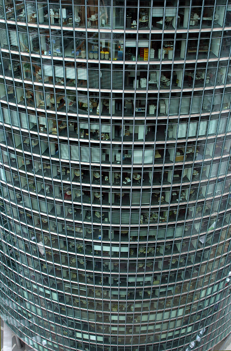 der runde Hochhausbau der DB in Berlin an einem arbeitsfreien Tag - festgehalten mit 16mm Zenitar Weitwinkel.