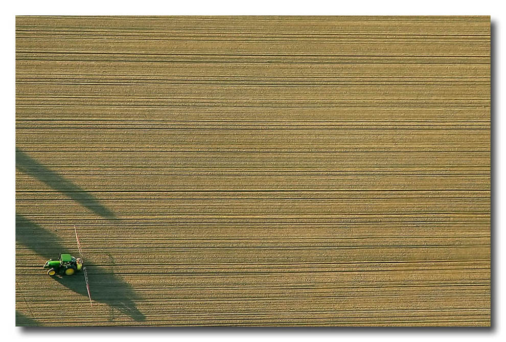 Ein Bauer bei der Feldbestellung, gesehen aus einem Heissluft-Ballon.