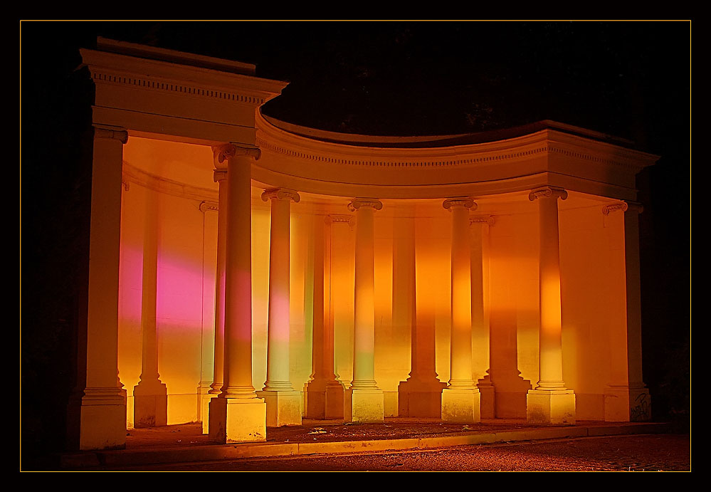 Eine Installation im Rahmen der Kunstausstellung "Lichte Wege" im Park Kassel Wilhelmshöhe. Nachtaufnahme in DRI-Technik.